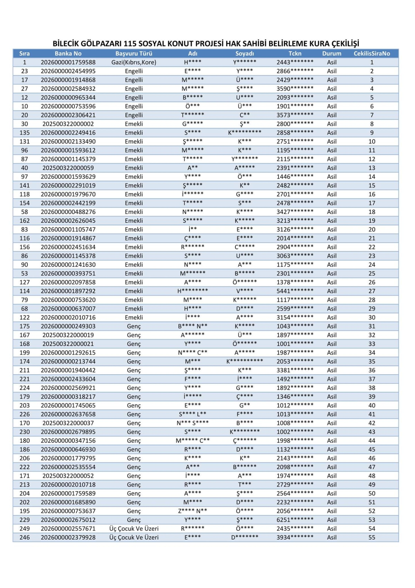 Yüzyılın Konut Projesi kapsamında ilçemizde inşa edilecek 115 sosyal konut için gerçekleştirilen kura çekilişi sonuçları açıklanmıştır.